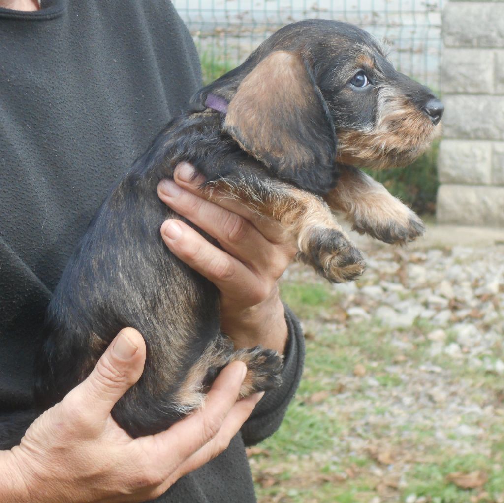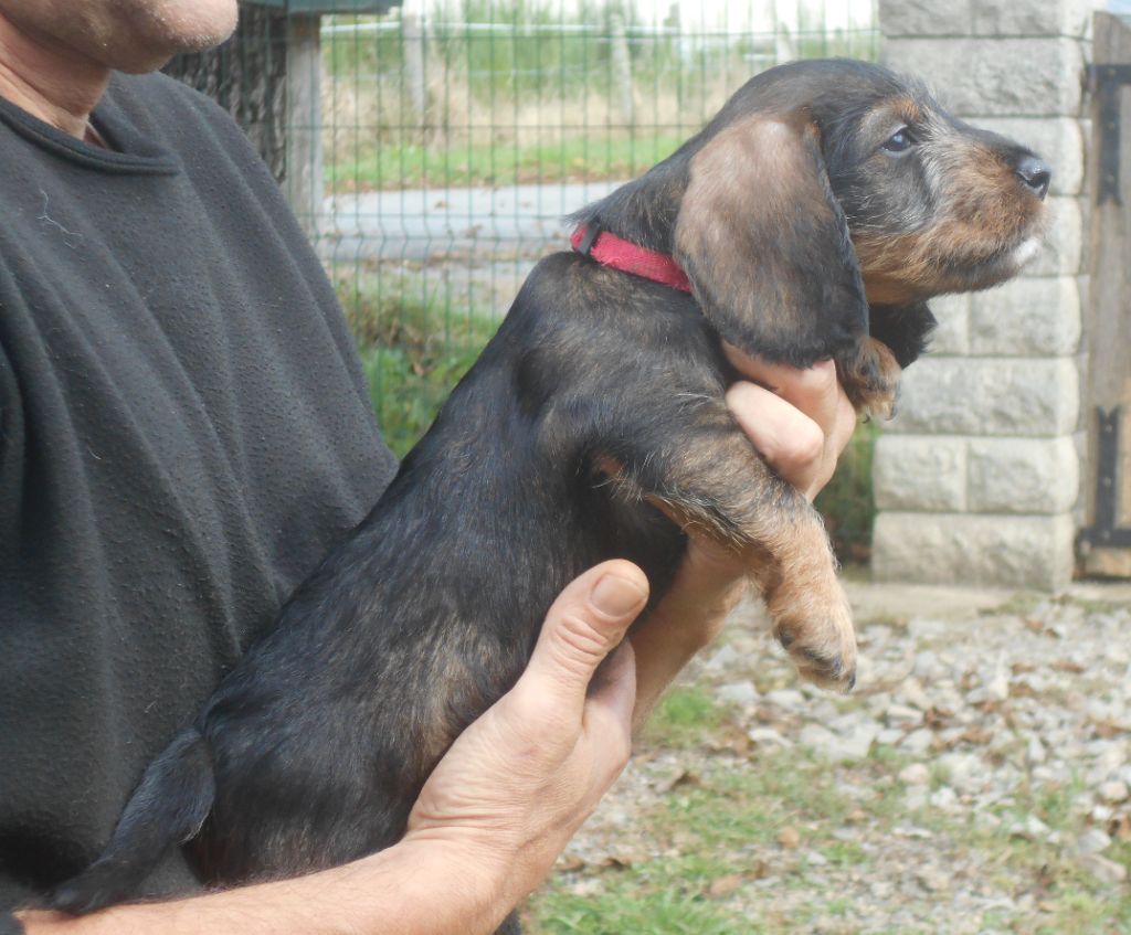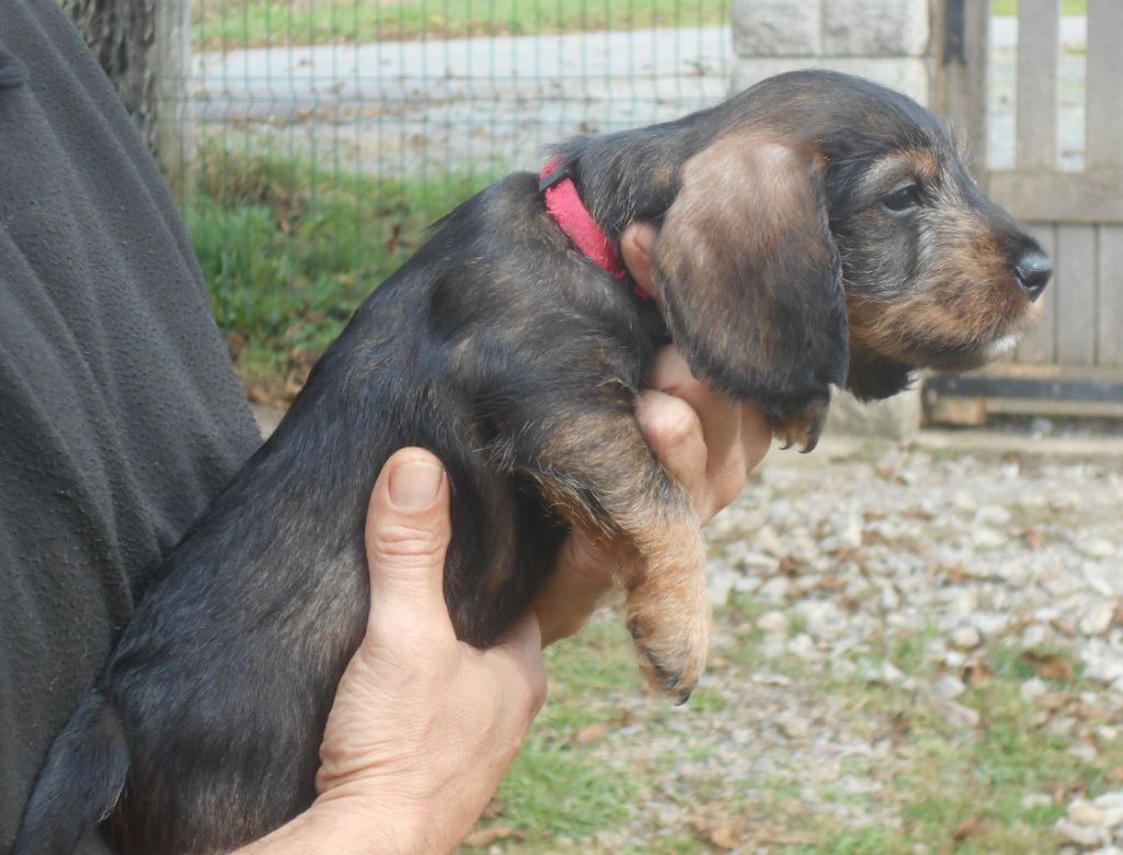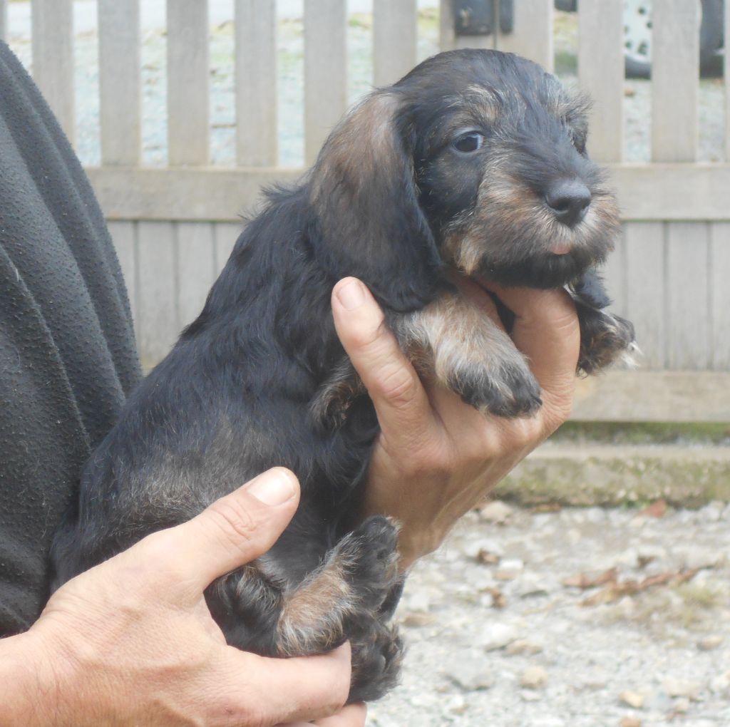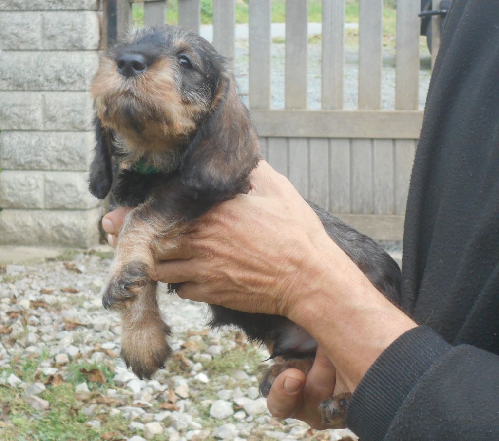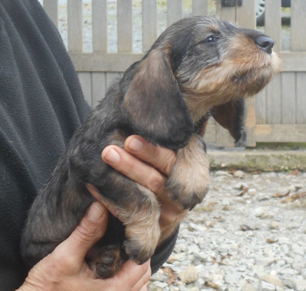 Ces petits ont tout ce qu'on attend d'un Teckel à poil dur: la couleur, le caractère, la morphologie et le poil bien sûr! C'est une belle portée de petits qui recherchent le contact humain, qui sont très gentils et très câlins.